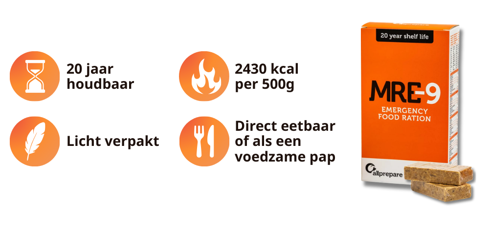 MRE-9 is een noodrantsoen met een houdbaarheid van 20 jaar, rijk aan essentiële vitamines en mineralen. Dit rantsoen is perfect voor de bewuste consument; MRE-9 is namelijk vegan, lactosevrij en volledig zonder GMO.