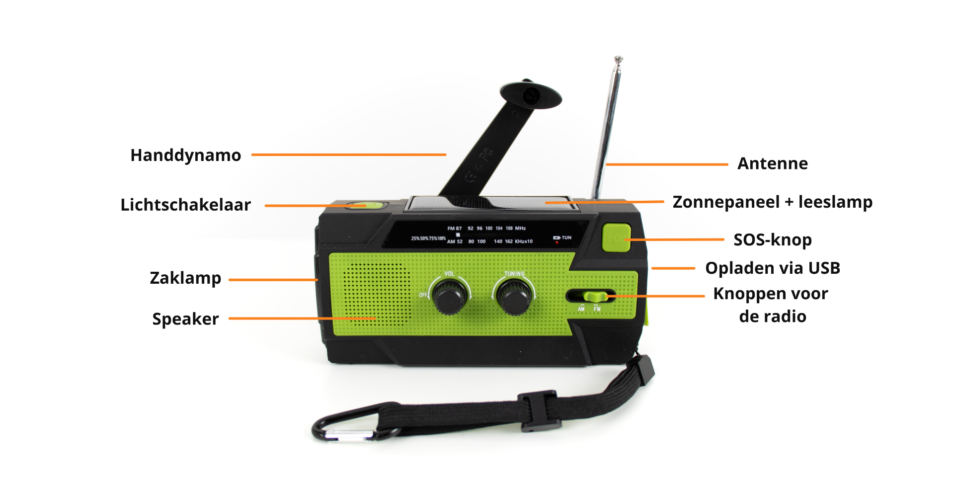 Deze noodradio met dynamo en zonnepaneel is uitgerust met verschillende handige extra functies. Zo beschikt hij over twee lichtbronnen: een compact leeslampje voor comfortabel lezen en een krachtige zaklamp die zorgt voor helder licht in het donker. Daarnaast is de radio voorzien van een handige SOS-functie. Met één druk op de SOS-knop activeer je een alarmsignaal om hulp te vragen in noodsituaties. Dankzij de praktische karabijnhaak neem je de radio bovendien eenvoudig overal mee naartoe.